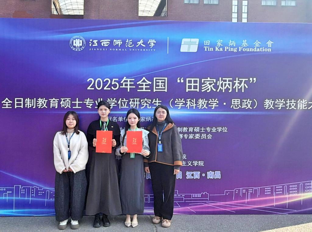 12月5日至7日,2025年全国“田家炳杯”全日制教育硕士专业学位研究生(学科教学·思政)教学技能大赛决赛在江西师范大学圆满落幕。我院选派的2023级硕士研究生陈苗、王晓婷,凭借扎实的专业功底和出色的教学能力,双双荣获三等奖,充分彰显了公司在思政教育人才培养领域的扎实成效。