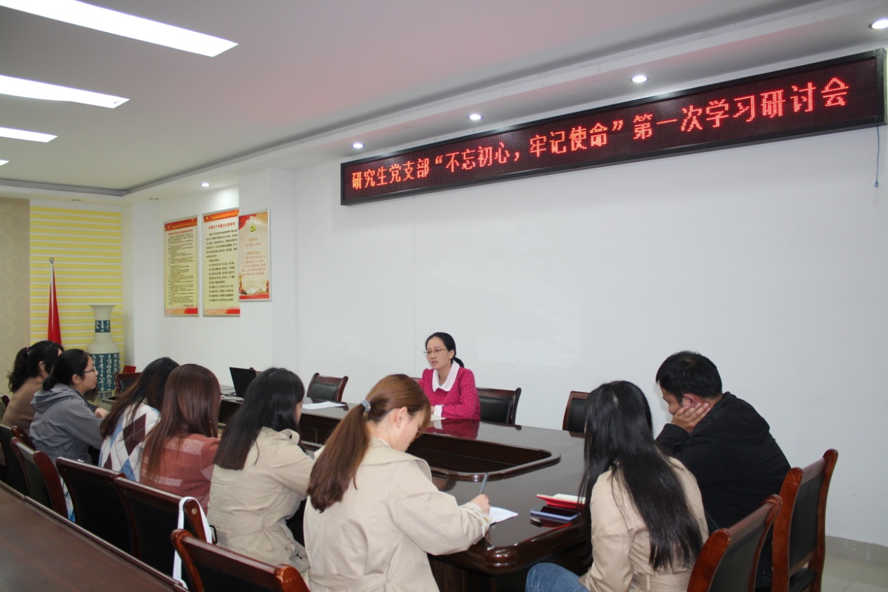 为提高党员政治觉悟,强化党员责任意识,10月29日下午,公司研究生党支部在社科楼323会议室开展了“不忘初心、牢记使命”主题教育第一次学习交流会,支部全体党员参加会议。会议由支部书记卢云晓主持。