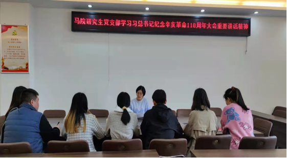 为深入学习贯彻习近平总书记纪念辛亥革命110周年大会重要讲话精神。10月19日,公司研究生党支部在社科楼323会议室开展学习习近平总书记纪念辛亥革命110周年大会重要讲话精神会议,研究生党支部全体成员参加,会议由支部书记郑晨霞主持。