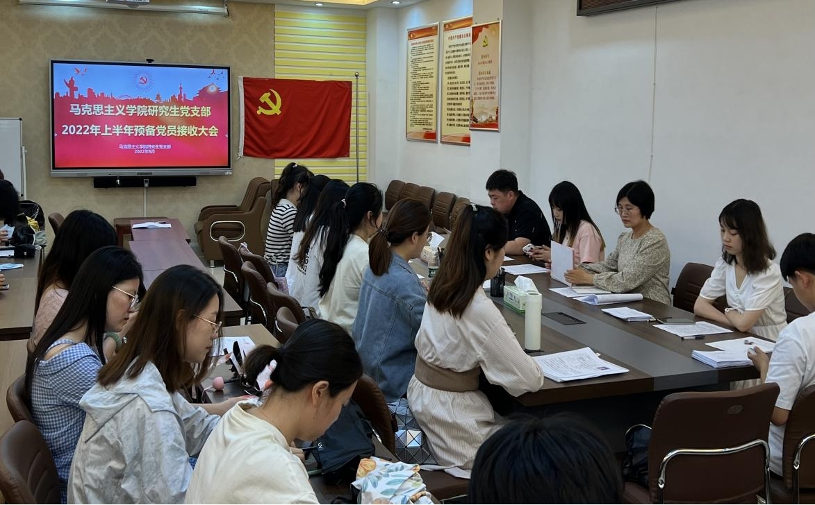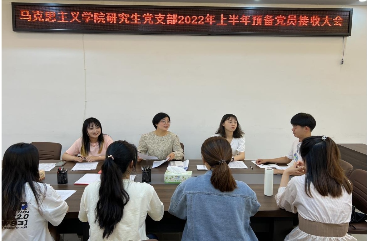 5月31日,公司研究生党支部于社科楼323会议室召开2022年上半年预备党员接收大会,讨论了余欢欢、张蒙蒙、赵子剑、赵婧同、陶小颍、郭婉如、 喻泳成、葛鸿萍八位同志转为中共预备党员的问题。会议由支部书记郑晨霞同志主持,彭燕担任监票人,王澳远担任计票人。