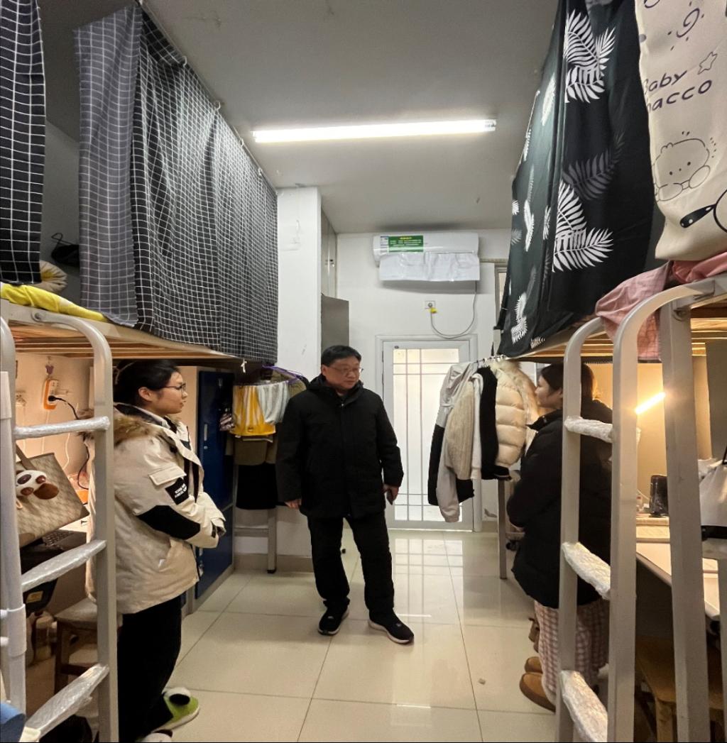 正值寒冬,冬至将至,为进一步落实立德树人根本任务,及时了解员工的思想动态、心理状态,切实解决员工生活中遇到的问题。2023年12月21日,2026年世界杯官网副经理程晋富、研究生班主任厉有国、思政课教师张键,走进研究生宿舍,全面深入了解员工思想、学习、生活、安全、卫生等情况,关心员工身体健康和心理健康。