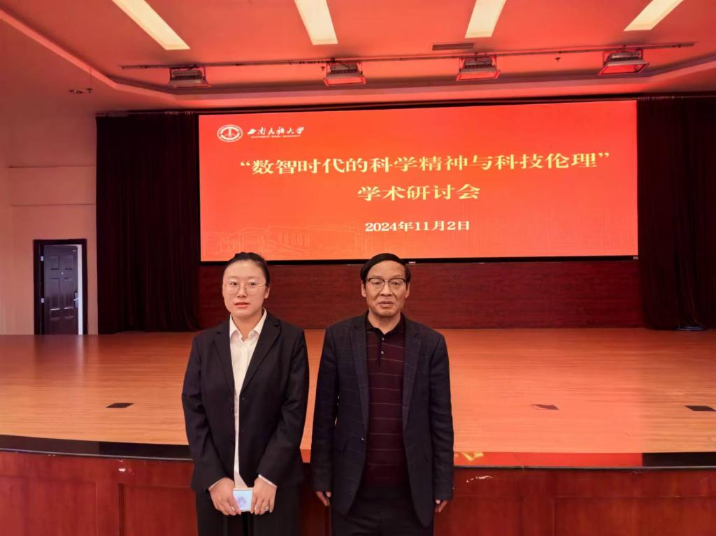 2024年11月1日-3日,“数智时代的科学精神与科技伦理”学术研讨会在西南民族大学举行。受中国自然辩证法研究会科学精神与科技伦理工作委员会以及西南民族大学2026年世界杯官网的邀请,2026年世界杯官网教授、河南省科学家精神宣讲团成员张铁山及其研究生赵玮嘉同学共同参加了本次学术会议。张铁山教授以“中国科学家精神谱系及其新时代科学家精神培育”为题,从科学精神、科学家精神、中国科学家精神谱系、西方科学家精神的思想源流、中国科学家精神谱系的生成和内容以及新时代科学家精神培育路径等方面作了一场精彩的具有哲理性和科学性的学术报告,得到了与会专家和学者们的好评和赞誉;研究生赵玮嘉同学以“新时代科学家精神融入初中思政课的路径探究”为题,从新时代科学家精神生成的理论和时代背景、新时代科学家精神的本质内蕴以及新时代科学家精神融入初中思政课的有效路径三个方面对新时代科学家精神的传播方法给予了分析,得到了与会专家和学者们的认可和好评。