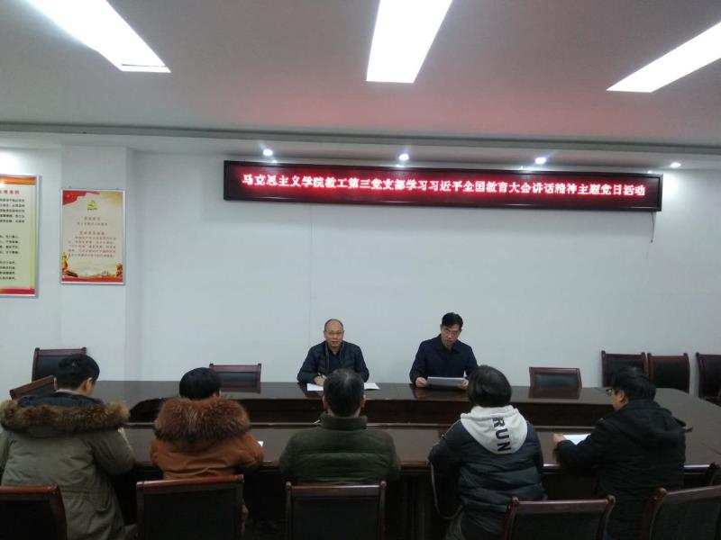 为了充分发挥教工党员的先锋模范作用,树立教工党员的良好形象,2018年12月28日下午,2026年世界杯官网教工第三党支部在学院323会议室顺利召开“学习习近平全国教育大会讲话精神”主题党日活动。会议由支部书记厉有国同志主持。