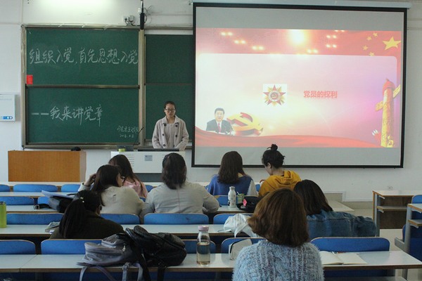 为引导党员发展对象学习党章、尊崇党章和践行党章,牢固树立党章意识,进一步做到思想入党,积极营造“人人学习党章、人人尊崇党章”的良好氛围,4月8日下午,公司第29期党员发展对象在社科楼515教室开展了“组织入党 首先思想入党--我要讲党章”活动。活动由本期党员发展对象组长徐豫资主持。
