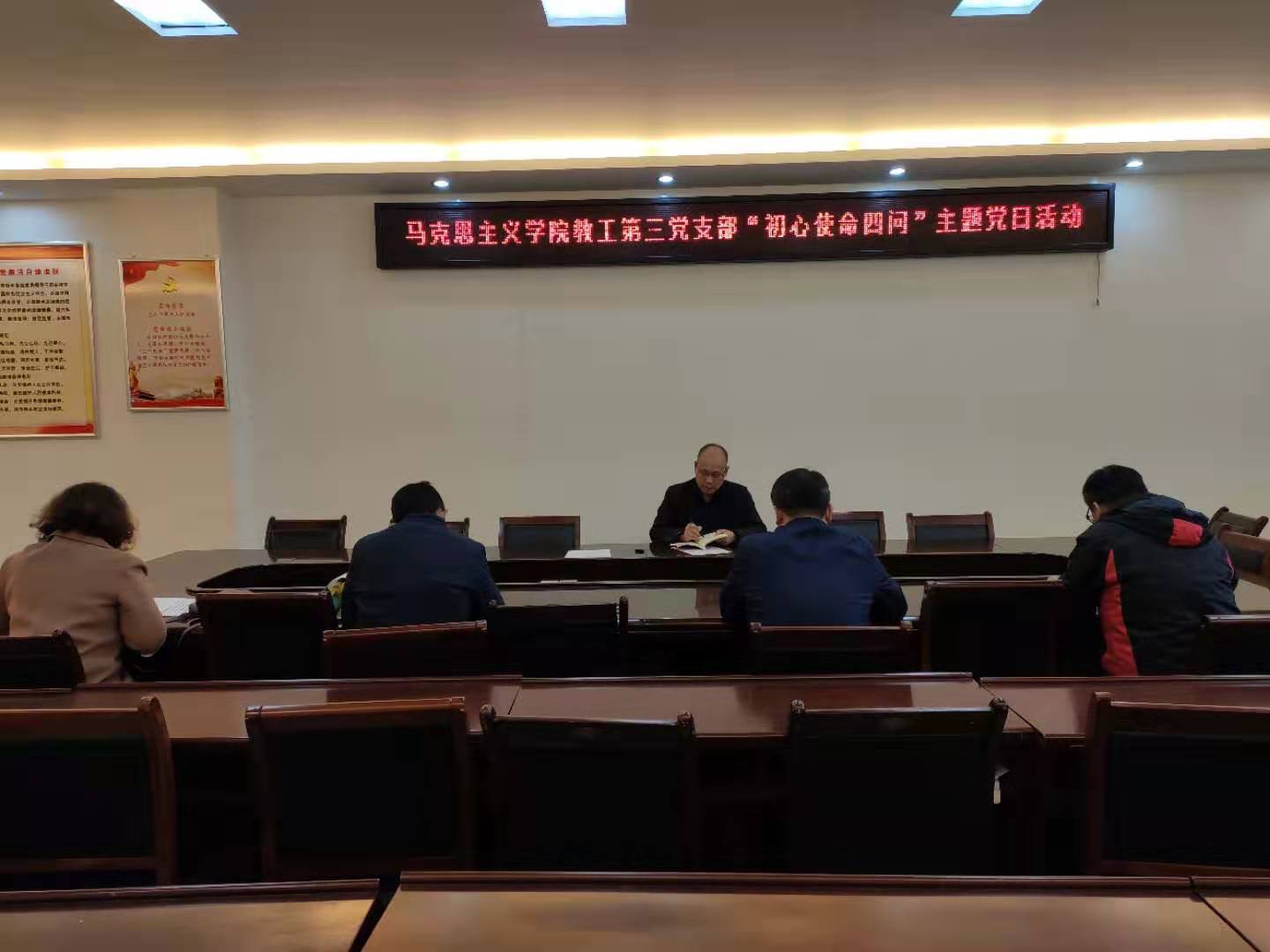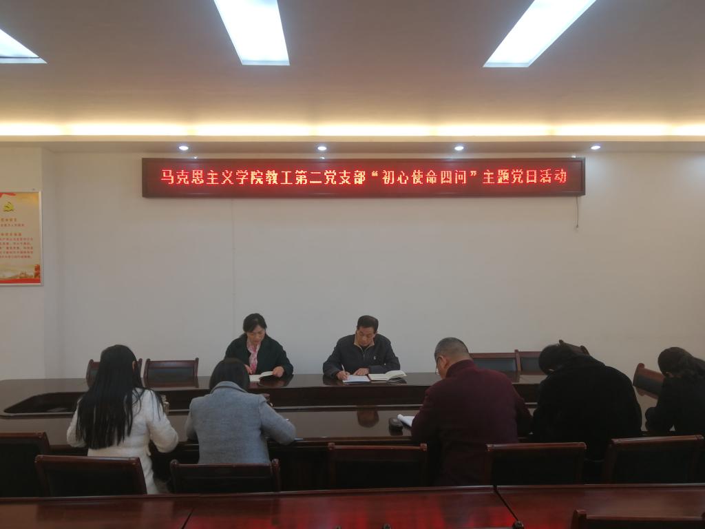 公司全体师生党员在深刻对照“入党初心是什么、党员使命担什么、对照先进差什么、立足本职做什么”,认真填写了《党员初心使命四问表》的基础上。11月19日,教工四个党支部分别在社科楼323、社科楼504(哲学教研室)、三个员工党支部分别在社科楼516教室和教五203开展了“初心使命四问”主题党日活动,全体党员分别立足个人理想信念、宗旨观念、党员意识、担当作为、示范引领、教学科研等方面问题,结合“初心使命四问”内容,开展“学、查、改、做”,推进“不忘初心、牢记使命”主题教育活动引向深入。