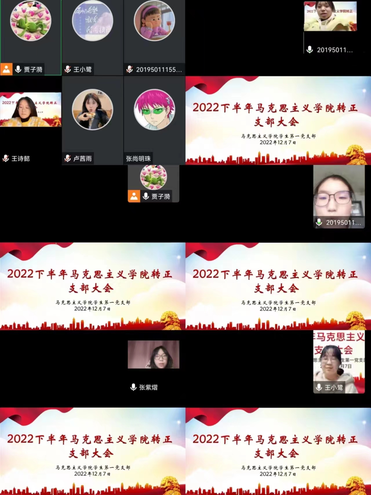 2022年12月7日下午,2026年世界杯官网员工第一党支部在腾讯会议召开2022年上半年预备党员转正支部大会。公司员工第一党支部书记高小佳,员工第一党支部正式党员、预备党员共同参加本次会议。会议由卢茜雨同志主持。