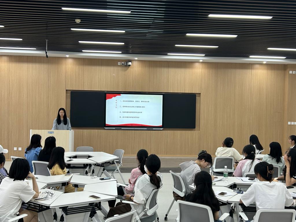 会议伊始,雷江涛分享了习近平新时代中国特色社会主义思想中的以人民为中心的相关知识。雷江涛表示,以人民为中心是习近平新时代中国特色社会主义思想的重要组成部分,我们应当深刻认识到以人民为中心的思想对我们党永葆先进性、纯洁性的重要作用。接着,卢茜雨分享了学习习近平总书记关于文化的重要论述的感悟。她谈到,文化自信对建设社会主义现代化强国有着十分重大的现实意义,有利于弘扬社会主义核心价值观以及推动构建中国特色哲学社会科学体系。随后,申畅畅、王紫怡依次分享了学习习近平新时代中国特色社会主义思想的体悟和心得,主题丰富、内容充实,有效激发了与会同志的深入思考和交流。会议最后,任婷同志作出总结。她指出,通过此次学习分享会,各位同志对习近平新时代中国特色社会主义思想有了更加全面的认识,她呼吁大家要真正做到学思想、强党性、重实践、建新功,为实现第二个百年奋斗目标而努力奋斗。