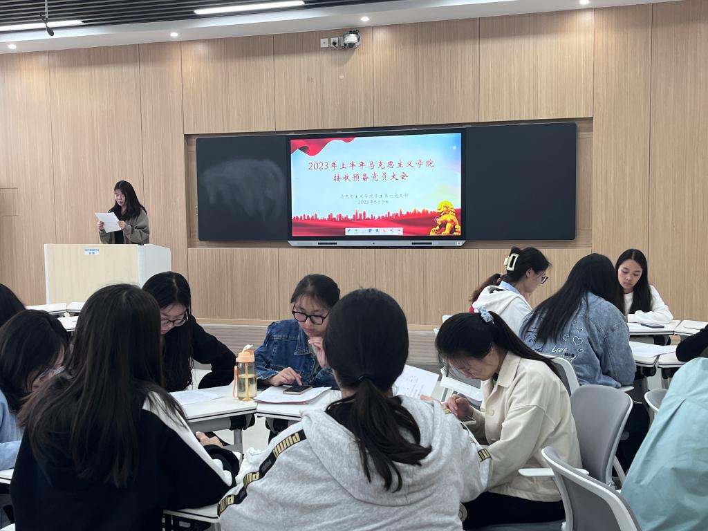 会议严格按照党组织接收预备党员的程序进行,共有九项议程。首先,卢茜雨清点到会人员,由组织委员贾子漪宣读党员发展对象名单。随后,曹佳颖、李明营、刁丹阳、段梦瑶、李心雨、杨煜琳、刘诗曼、徐铬、田菲、王兆影、王岚霄十一名申请人依次宣读《入党志愿书》,汇报自己对党的认识、入党动机、现实表现、家庭和主要社会关系情况,深切表达了加入中国共产党的意愿和决心。接着,入党介绍人高小佳简要介绍了十一位申请人的教育和考察的情况,并对是否接收党员发展对象为预备党员提出了意见。随后,与会党员进行投票表决。经支部表决,一致同意接收曹佳颖等十一名同志为中国共产党预备党员。最后,高小佳总结发言,她表示,所有正式党员和预备党员应在今后的生活中继续保持坚定的立场,坚定不移听党话、跟党走,发挥党员先锋模范作用,让青春在全面建设社会主义现代化国家的火热实践中绽放绚丽之花。