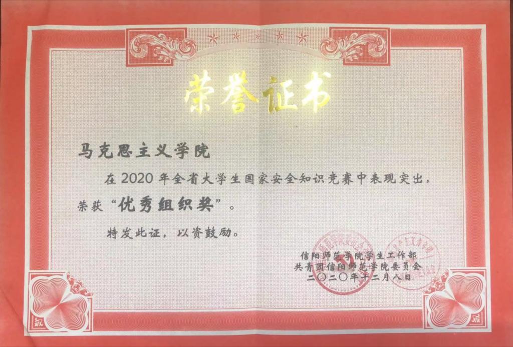 经信阳师范学院员工工作部以及共青团信阳师范学院委员会考核审定,公司在集团举办的2020年全省老员工国家安全知识竞赛中积极参与、表现突出,荣获“优秀组织奖”。
