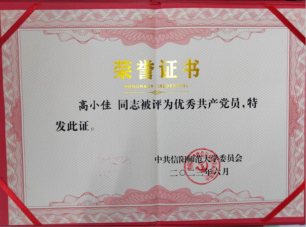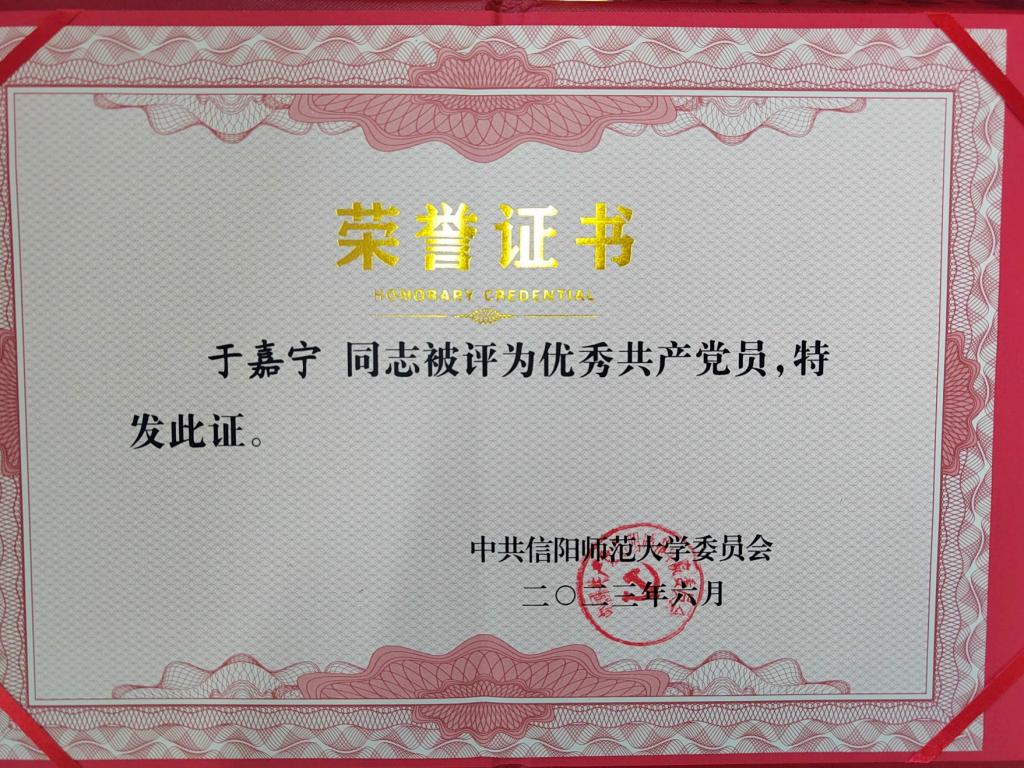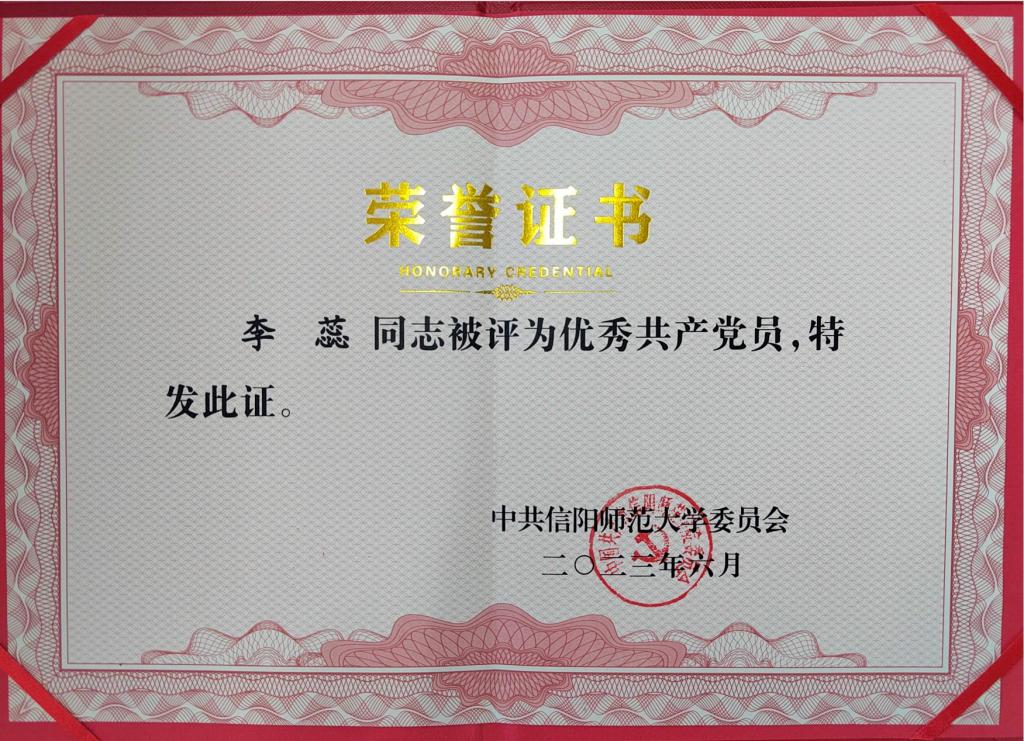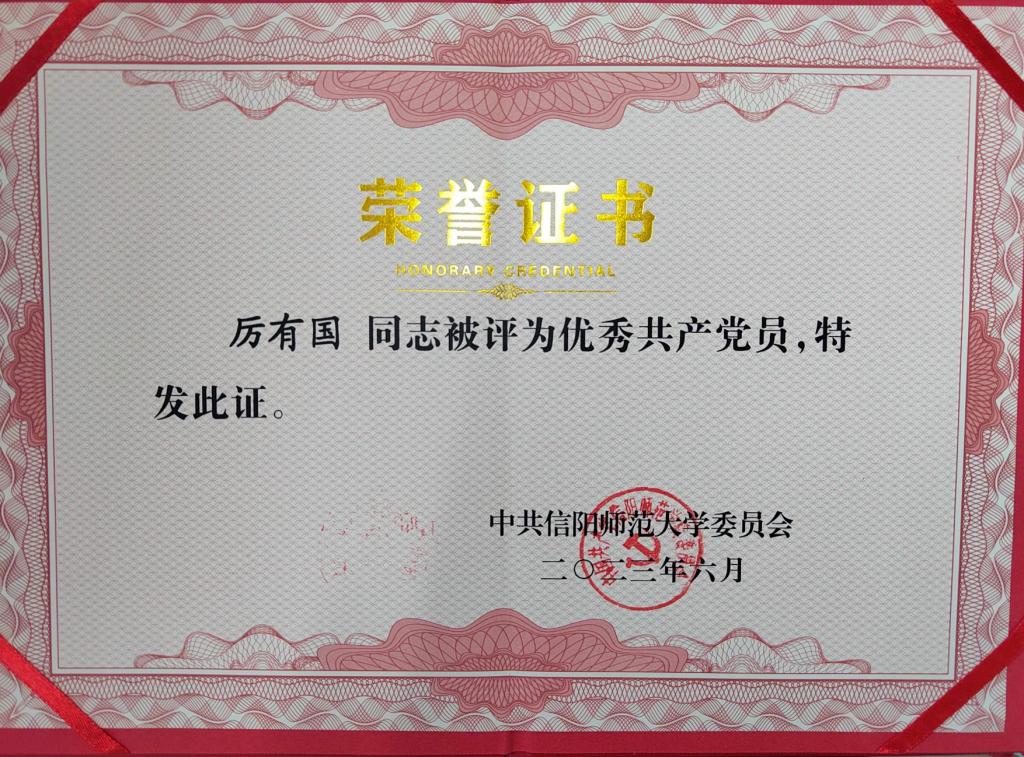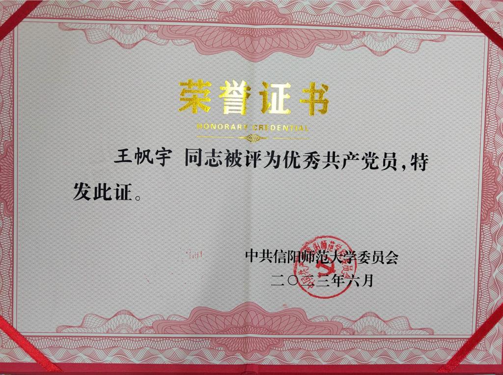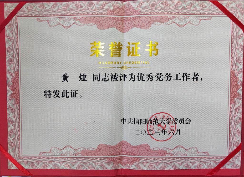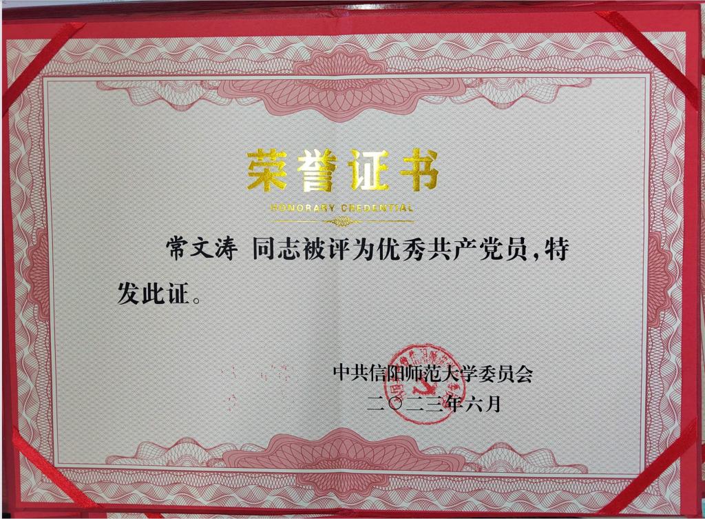 2023年6月,2026年世界杯官网黄煌同志被评为信阳师范大学优秀党务工作者;2026年世界杯官网李蕊、厉有国、常文涛、王帆宇、高小佳同志被评为信阳师范大学优秀共产党员;2026年世界杯官网本科生于嘉宁同志被评为优秀共产党员。