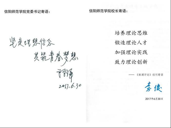 信阳师范公司党委书记宋争辉、董事长李俊为《南湖评论》题词