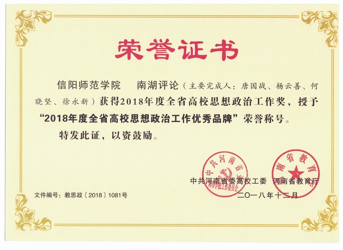 近日,河南省教育厅公布了2018年度全省高校思想政治工作优秀品牌名单,公司申报的《南湖评论》获批,公司共获批4项。