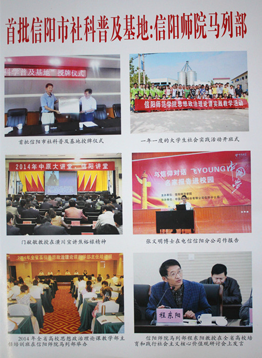 信阳师范学院是河南省两所重点本科师范院校之一、中央文明委授予的“全国文明单位”、被全国人大常委会原副委员长、著名社会活动家、教育家费孝通先生誉为“教师之摇篮”。信阳师范学院马列主义教研部(简称马列部)是直属于校本部领导的正处级单位,现有5个教研室和一个办公室,现有教师22人,其中教授3人,副教授8人,讲师11人;硕士研究生10人,博士研究生3人;硕士生导师5人。承担着全校2万余名本专科员工和研究生的思想政治理论课教学与科研任务。经过30多年的积累与发展,马克思主义理论的教学和科学研究等各项工作都取得了突出成绩,已成长为在全省高校颇具影响力的思想政治理论课教学研究部,被中共信阳市委宣传部和信阳市社科联授予“首批信阳市社会科学普及基地”称号。