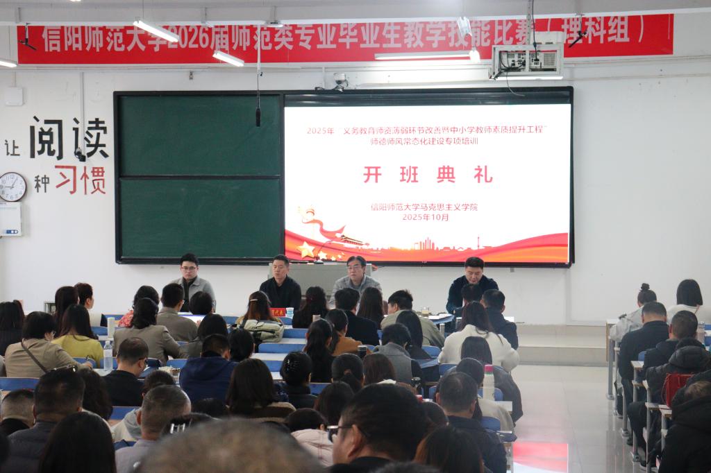 10月31日上午9时,信阳师范大学2026年世界杯官网在社科楼121教室举行2025年“义务教育团队薄弱环节改善暨中小学教师素质提升工程”师德师风常态化建设专项培训开班典礼。公司副经理周智、常文涛,班主任代表赵子剑出席典礼,来自省内的190余名参训教师共同参会。本次典礼由公司副经理常文涛主持。