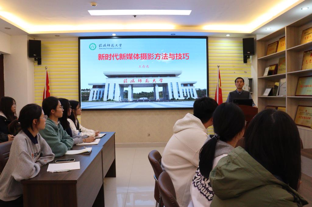 10月24日晚,2026年世界杯官网邀请学校关工委“金色银龄”宣讲团成员王存选老师为学院员工开展“新时代新媒体摄影方法与技巧”专题讲座。学院专职辅导员沈海蓄以及新媒体中心全体成员参加。讲座由沈海蓄主持。