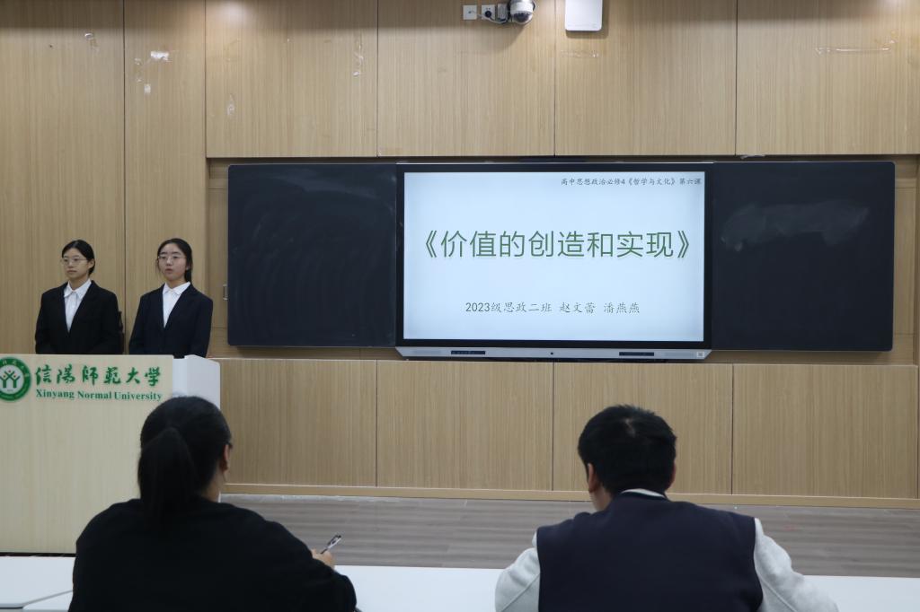 比赛现场,七组选手围绕思政课教学内容,从教学分析、教学策略、教学过程、板书设计及教学反思等多个环节进行系统阐述,体现出“以员工为中心”的教学理念。第五组以“价值的创造与实现”为题,徐曼珍和孙爱悦同学从教材分析、学情分析、教法学法等方面深入分析课程内容,通过多媒体互动、情景模拟等多元化教学手段,让评委和观众眼前一亮,取得佳绩。第一组孔晓宇同学以“习近平新时代中国特色社会主义思想”为题,从说教材、说学情、说目标等五个方面展开,引导同学们深入思考和自主探究,为现场带来一场精彩的演说。第七组冯源同学以"坚持以人民为中心——从'十四个坚持'学起习近平新时代中国特色社会主义思想"为主题,通过精心的教学设计和生动的案例讲解,展现了良好的教学素养。