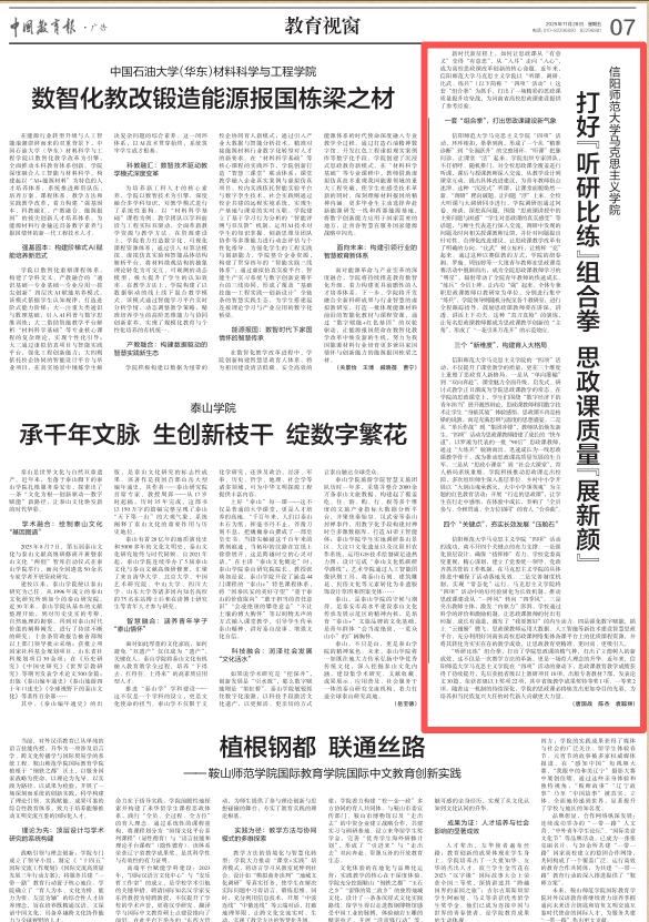 2025年11月28日,《中国教育报》第7版以《打好“听研比练”组合拳 思政课质量“展新颜”》为题,专题报道了我公司推进思政课建设的新理念、新举措、新成效。