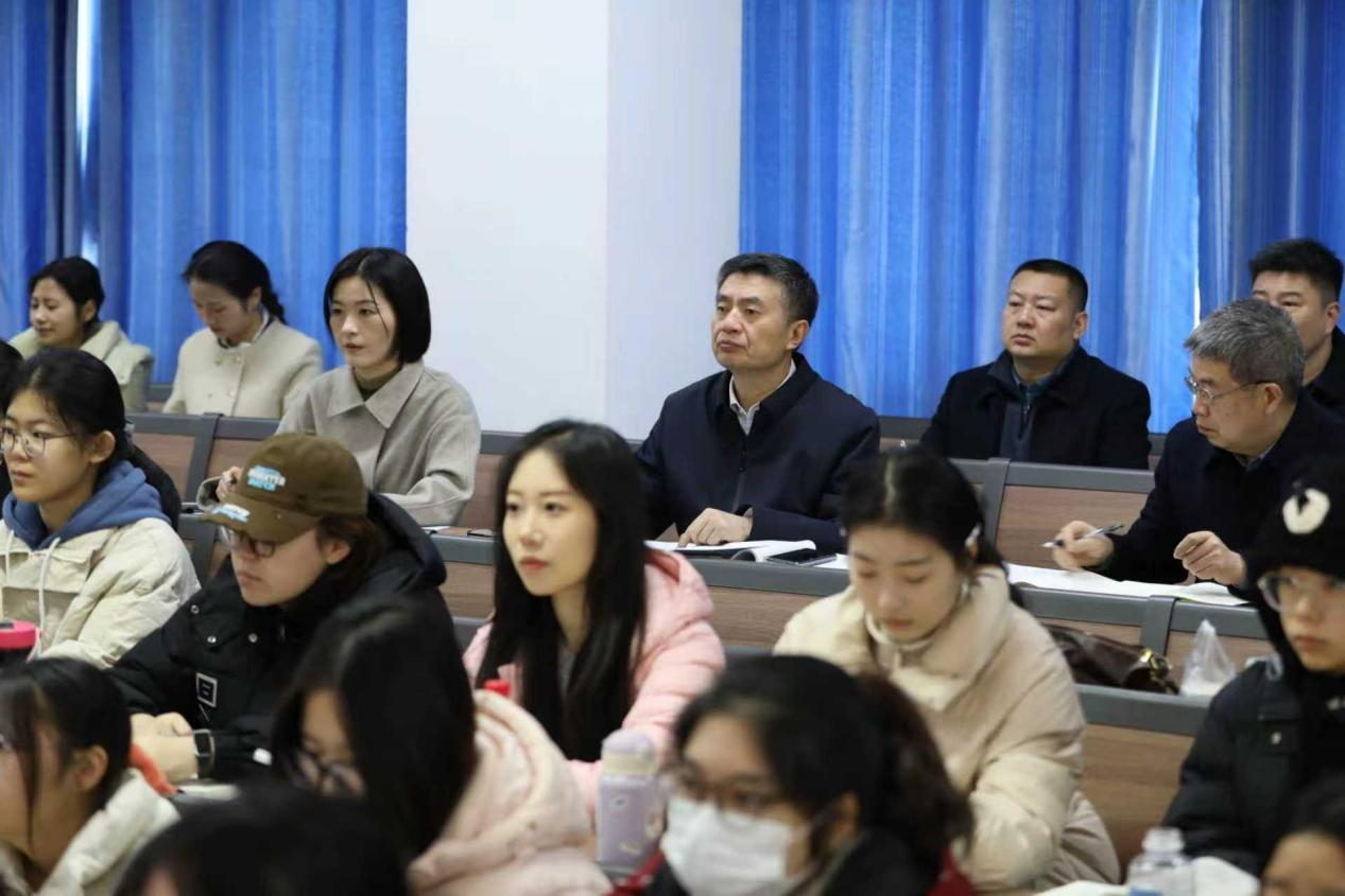 12月11日上午,在教六楼201教室,王娟听取了黄玲丽老师讲授的《习近平新时代中国特色社会主义思想概论》“维护和塑造国家安全”章节。王娟在肯定教学成效的同时,就紧扣时政热点、加强集体备课等提出指导意见。