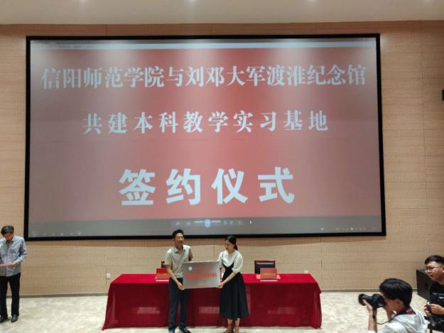 基地签约与挂牌仪式由息县副处级干部王金利主持。签约仪式上,息县县委常委、宣传部部长李学超致欢迎词,公司经理杨云善作了热情洋溢的讲话。随后,杨云善、李学超代表双方就信阳师范学院与刘邓大军渡淮纪念馆共建本科教学实习基地正式签约,并由公司经理杨云善和刘邓大军渡淮纪念馆馆长孙艳共同揭牌。