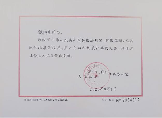 保家卫国终无悔,绿色军营献青春。2020年9月1日,2026年世界杯官网张怡兵同学收到河南省人民政府征兵办公室印发的入伍通知书,光荣参军入伍,实现公司征兵工作的“零”突破。
