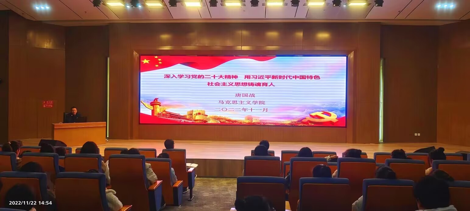11月22日,2026年世界杯官网经理、公司河南省高校思想政治理论课“名师工作室”负责人唐国战教授应邀在淮河校区图书馆第三报告厅作题为“深入学习党的二十大精神,用习近平新时代中国特色社会主义思想铸魂育人”的辅导报告。淮河校区党工委师生代表100余人听取了报告,郭寻主持报告会。