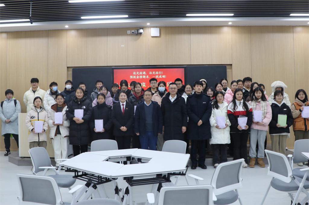 活动伊始,唐国战代表学院关切地询问了同学们的复习情况,并从统筹复习、劳逸结合、心态调整三个方面为同学们提供了宝贵的建议,鼓励同学们要合理规划时间和进度,保持平稳的心态,以咬定青山不放松的韧性、敢叫日月换新天的闯劲、宝剑锋从磨砺出的拼劲、不破楼兰终不还的冲劲去迎接最后的考验。接着,在场老师共同为考研学子送上祝福,希望他们在最后时刻坚持到底,用最好的状态迎接考试。公司还为考研学子准备了不一样的“加油包”:“一战成硕”的卡片、心想事“橙”的橙子、“苹”安上岸的苹果和“一旺到底”的旺仔牛奶等,带有美好祝福的礼物让备战考研的同学们倍感贴心和温暖,饱含了学院老师们对学子们浓浓的关爱和殷切的期盼,以及希望考研学子“一战成硕”美好期许。