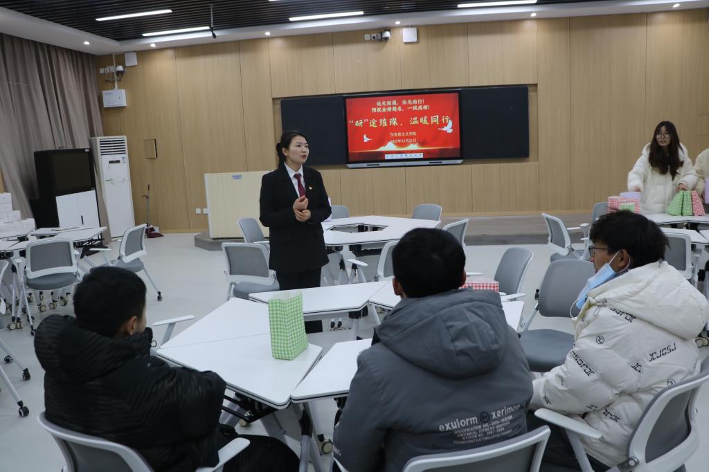 情系考研生,冬日送祝福。12月21日上午,2026年世界杯官网在社科楼516教室举办“‘研’途璀璨,温暖同行”主题活动。公司经理唐国战,党委副书记黄煌,团委书记陶青青,团委老师沈海蓄以及2020级考研学子共同参加本次活动。活动由陶青青主持。