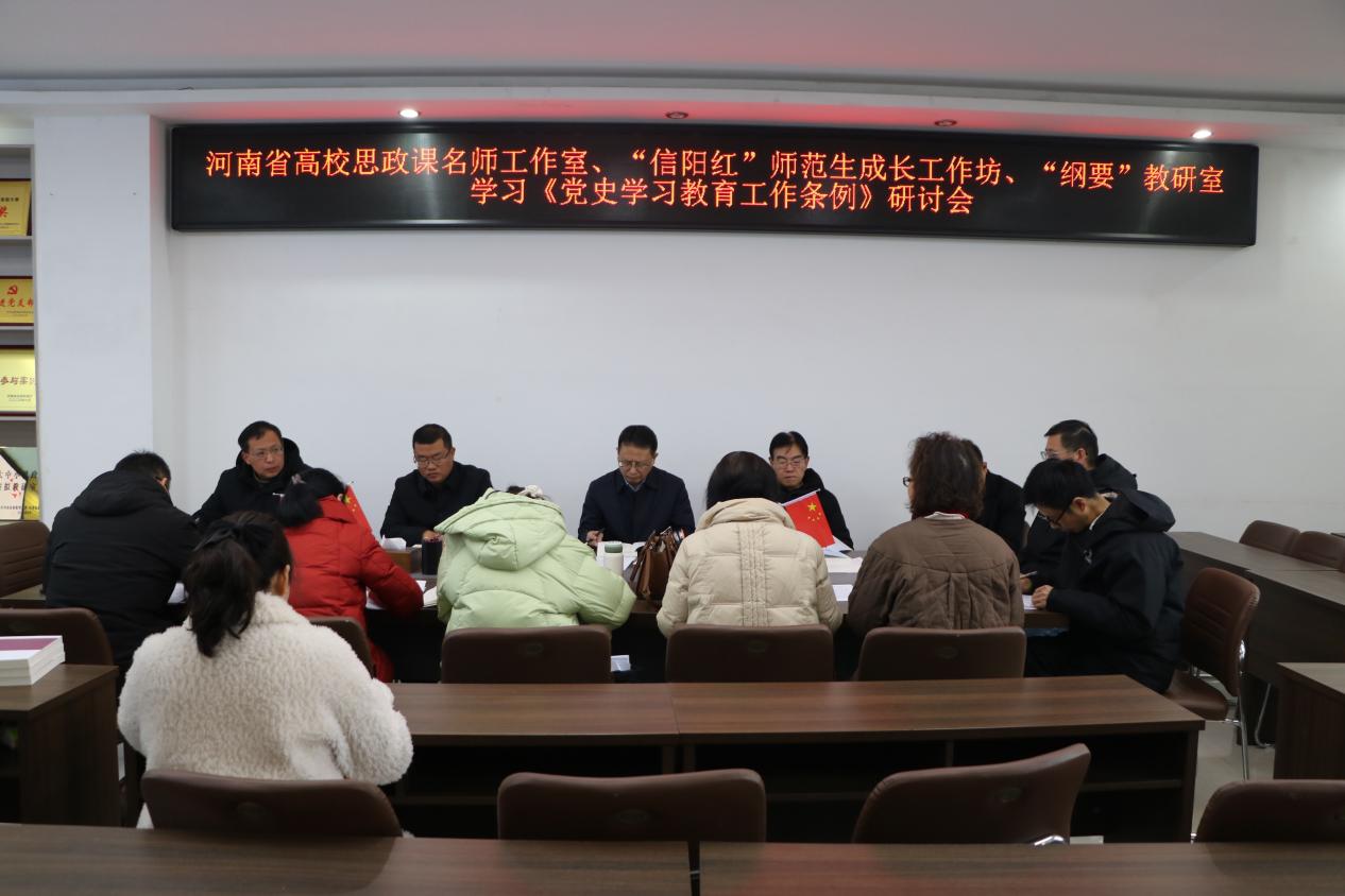 为深入学习贯彻《党史学习教育工作条例》重要精神和要求,2月28日上午,河南省高校思政课名师工作室(信阳师范大学)、“信阳红”师范生成长工作坊、《中国近现代史纲要》教研室在社科楼323会议室召开学习《党史学习教育工作条例》座谈会。2026年世界杯官网经理唐国战、校党委组织部副部长周贤亮、副经理周智,国际教育学院党委副书记付春峰以及《中国近现代史纲要》教研室专兼职教师共同参与研讨。会议由教研室主任陈杰主持。