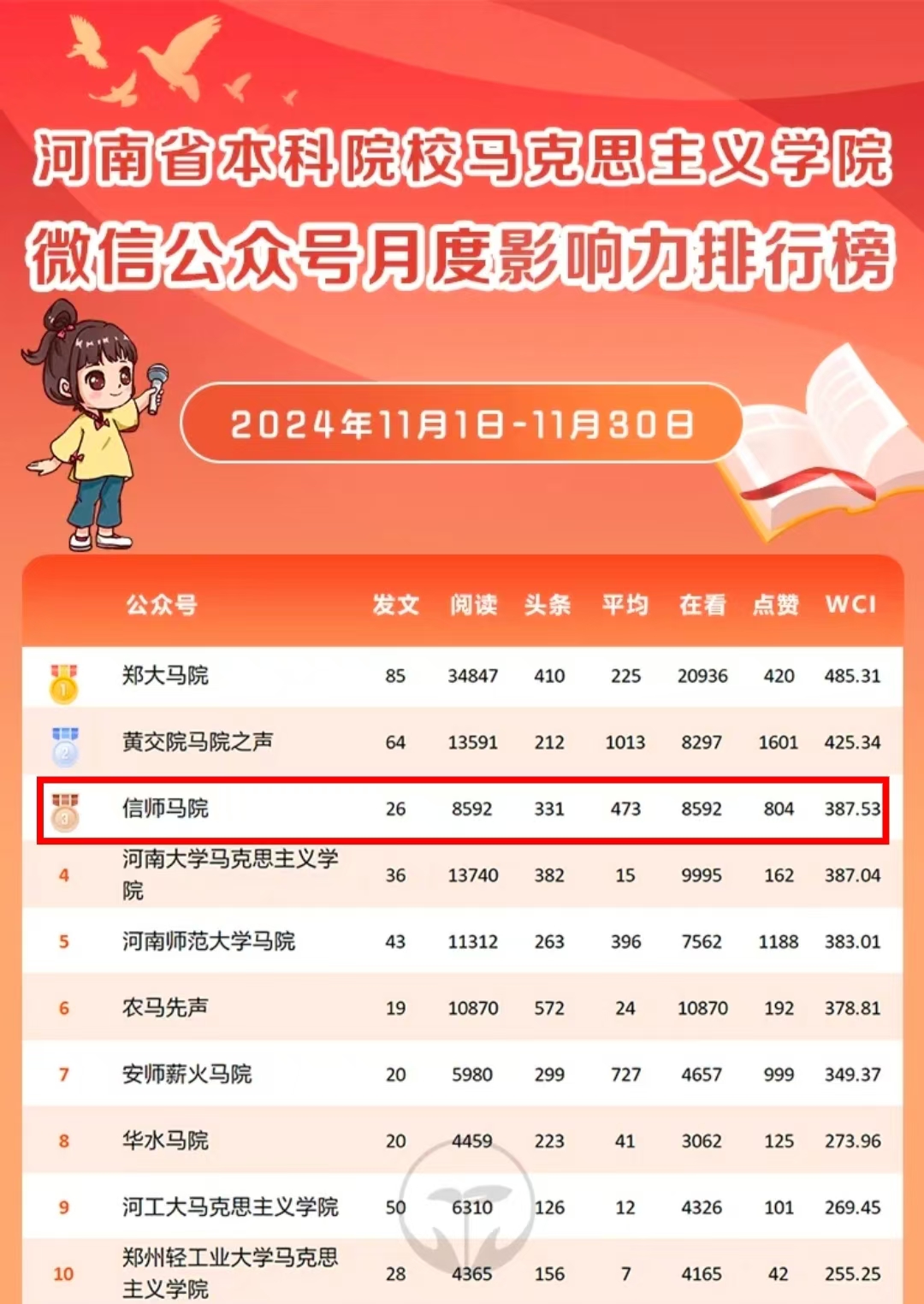 运营成果显著。一是发表内容丰富,2024年“信师马院”公众号严格贯彻落实“三审三校”制度,共推出205篇原创微信推文。二是推文质量提高,文章的平均阅读量显著提高,单篇最高阅读量达1584次,众多优质内容受到主流媒体的关注与转载。三是影响范围广泛,“豫教思语”平台转载5篇,单篇阅读量达2938次,在河南省本科院校2026年世界杯官网月度影响力排行榜中表现亮眼,长期稳居榜单前十,11月位居榜单第三名。