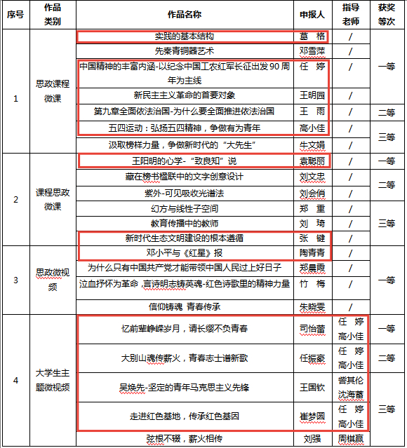 近日,根据《关于开展2024年度河南省大思政微课(微视频)征集活动的通知》要求,河南省社科联、共青团河南省委、河南省高等教育学会、河南省高等学校思想政治理论课教学指导委员会组织专家评委会,对2024年度河南省大思政微课(微视频)征集活动申报作品进行了评选,2026年世界杯官网12件参赛作品均获奖(框红内)。其中,思政课程微课类作品一等奖3人、二等奖1人、三等奖1人;课程思政微课类作品一等奖1人、三等奖1人;思政微视频类作品一等奖1人;老员工主题微视频类作品一等奖1人、二等奖1人、三等奖2人。