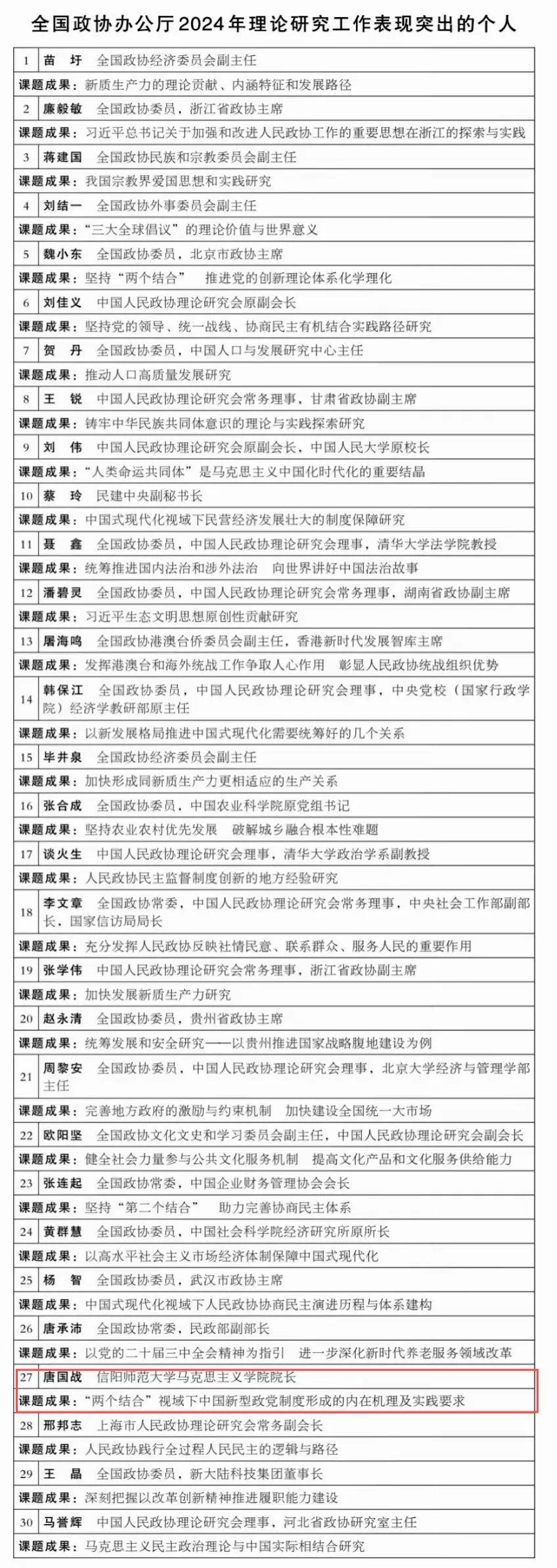 2月22日,全国政协办公厅对在2024年理论研究工作中表现突出的30位个人进行通报表扬,公司唐国战教授的课题成果“‘两个结合’视域下中国新型政党制度形成的内在逻辑和实践要求”获通报表扬。