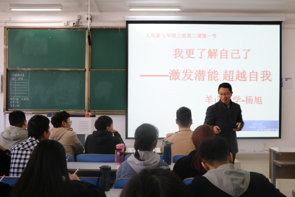 信阳市羊山中学优秀思政课教师杨旭老师以“我更了解自己了——激发潜能 超越自我”为题展开教学。他首先划分了6个课堂活动小组,充分发挥员工主动性,用课前小游戏的方式导入新课,通过问题思考、师生交流、集中讨论、小组发言、成果评比等方面展开教学,展讲了一节生动、互动、精炼、精彩的示范课。本次示范课,着眼于提升员工专业素养、编织教学素材、驾驭教学环节、营造课堂氛围、提升教学效果等方面。通过一线优秀教师讲授示范课,员工们更加直观地感受到了“优质课程是什么样的、如何讲好一堂优质课”,在推动员工自我塑造优秀中学教师方面发挥了积极作用。