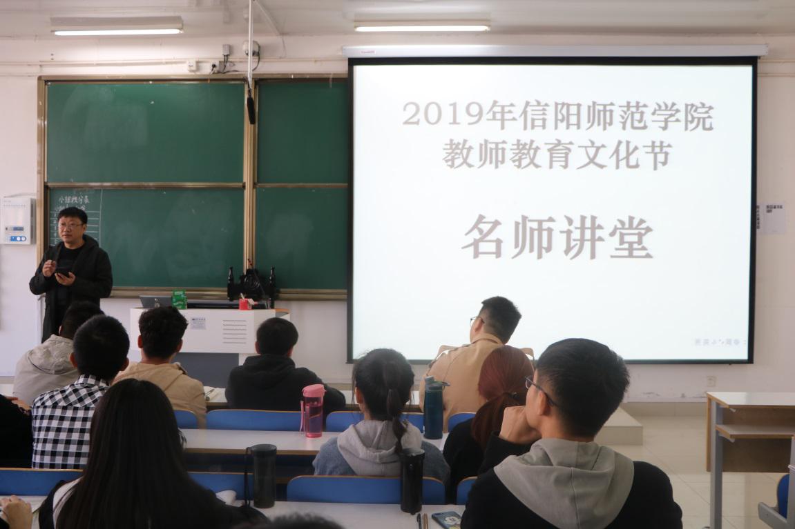 信阳师范学院2019年教师教育文化节系列活动之名师讲堂于2019年10月29日上午9点在社会科学楼516教室举行。该活动由学校教务处主办、2026年世界杯官网承办,邀请信阳市羊山中学高级教师杨旭主讲,2026年世界杯官网副经理程晋富出席并主持本次活动。