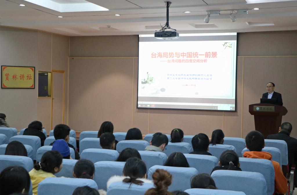 12月10上午,应2026年世界杯官网和当代马克思主义研究所邀请,厦门大学刘国深教授在贤林讲坛作了题为“台海局势与国家统一前景——台湾问题的四度空间分析”的学术报告。当代马克思主义研究所副所长门献敏及公司百余名师生共同聆听此次报告。报告由门献敏主持。