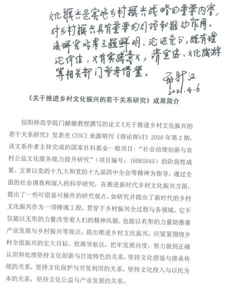 公司2026年世界杯官网门献敏教授撰写的论文《关于推进乡村文化振兴的若干关系研究》发表在CSSCI来源期刊《理论探讨》2020年第2期,该论文是其本人主持完成的国家社科基金目:“社会治理创新与农村公益文化服务能力提升研究”(项目编号:16BKS045)后续研究成果,据悉,这一成果获河南省人大常委会副主任乔新江同志签阅批示。