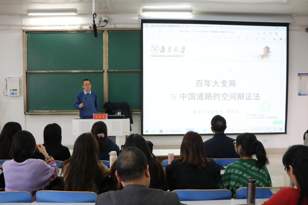 刘怀玉从中国道路“革命的”空间突围、“建设的”空间探索、“发展的”空间构建、“复兴的”空间创造四个历史时期对中国的空间建构进行了深入分析。结合世界格局的发展变化,他指出,中国道路探寻在百年变局中经历“被动卷入—打破藩篱—主动参与—引领格局”的辩证逻辑。他强调,必须辩证认识和把握国内外大局势,统筹中华民族伟大复兴战略全局与世界百年未有之大变局,深刻认识错综复杂的国际环境带来的新矛盾新挑战,增加机遇意识与风险意识。会后,刘怀玉在社科楼323会议室,与公司师生进行座谈交流,就各位老师在国社科项目申报选题中遇到的问题进行了认真详细的解答。