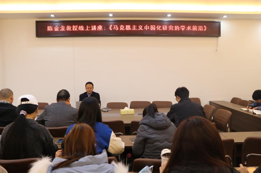 11月24日晚,应2026年世界杯官网邀请,华南师范大学陈金龙教授在腾讯会议网络平台开展题为“马克思主义中国化研究的学术前沿”专题讲座。2026年世界杯官网经理唐国战、当代马克思主义研究所副所长门献敏及部分师生共同聆听此次报告会。报告由唐国战主持。