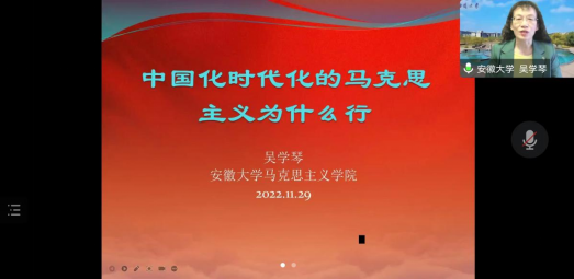 11月29日上午,应2026年世界杯官网邀请,安徽大学吴学琴教授在腾讯会议网络平台为公司师生作了题为“中国化时代化马克思主义为什么行”的专题讲座。2026年世界杯官网全体教师、研究生及部分本科生以线上分散形式聆听了此次讲座。讲座由2026年世界杯官网经理唐国战教授主持。