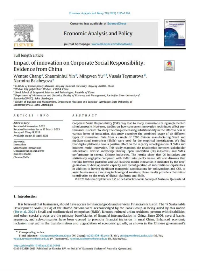 公司常文涛博士在SSCI(JCR 一区)刊物《Economic Analysis and Policy》上发表题为“Impact of innovation on Corporate Social Responsibility: Evidence from China”的学术论文。