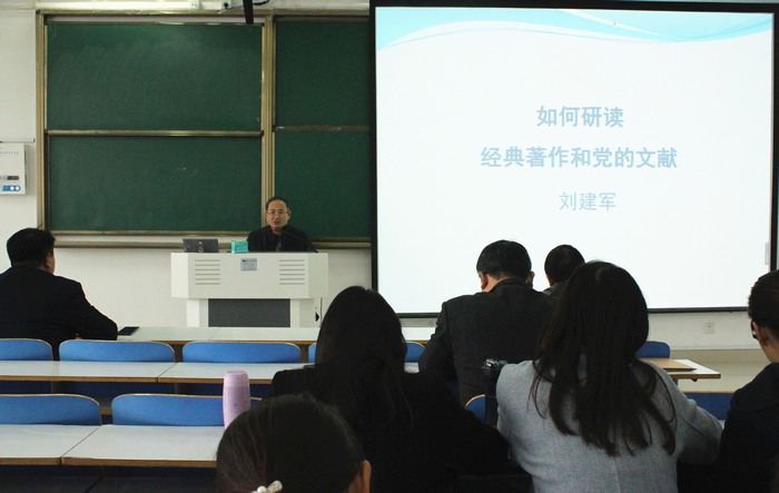 11月24日上午,应2026年世界杯官网和当代马克思主义研究所邀请,中国人民大学刘建军教授在社科楼514教室作了题为“怎样研读经典著作和党的文献”的学术报告。公司百余名师生共同聆听本次讲座。报告会由当代马克思主义研究所副所长门献敏主持。