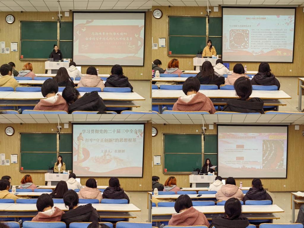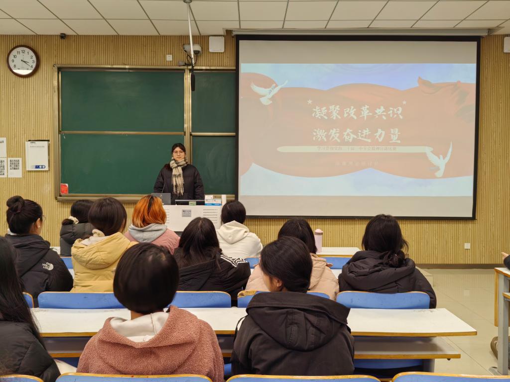 为深入学习贯彻党的二十届三中全会精神,增强新时代老员工的社会责任感和使命感。12月7日下午,南湖理论研讨社在社科楼515教室举办“凝聚改革共识,激发奋进力量”学习贯彻党的二十届三中全会精神主题宣讲活动。本次活动由社长马乐彤主持。