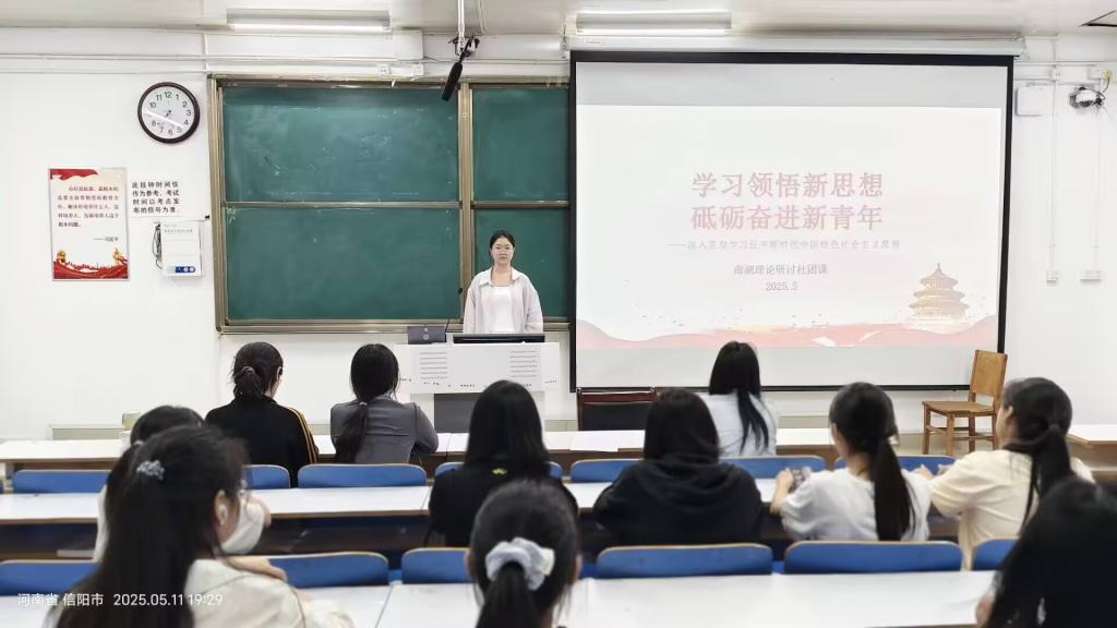 为深入学习习近平新时代中国特色社会主义思想,增强同学们内心的使命感和责任感,5月11日晚上,南湖理论研讨社在社科楼514教室举办了“学习领悟新思想,砥砺奋进新青年”主题团课。本次活动由团支书范茜茜主持,社团干事和各院成员共同参加。