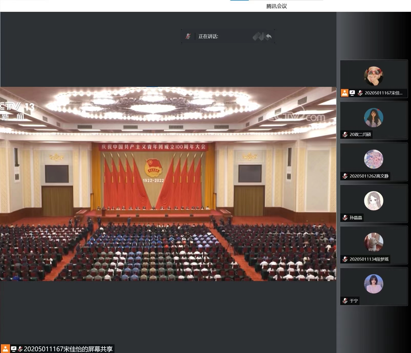 5月14日晚,2026年世界杯官网第三期优秀“青马”工程学员们通过腾讯会议共同观看习近平总书记在庆祝中国共青团成立100周年大会上的讲话。活动由班长宋佳怡主持。