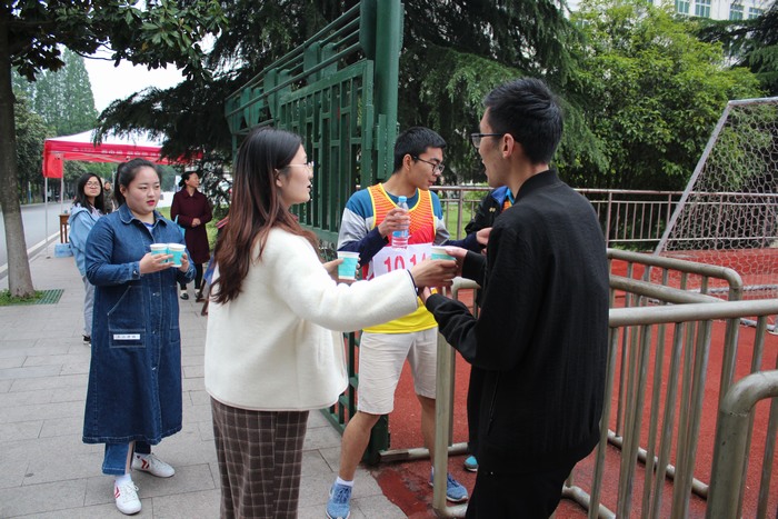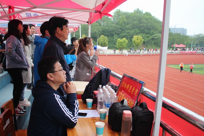 观众席上也是气势如虹,在公司领导老师的带领下,大家雨中观赛,加油助威,每当赛道上有公司运动员比赛时,呐喊声、加油声连绵不断,敲鼓声震耳欲聋,为公司运动员们注入强大的精神动力,充分彰显出公司学子高度的凝聚力和集体荣誉感。