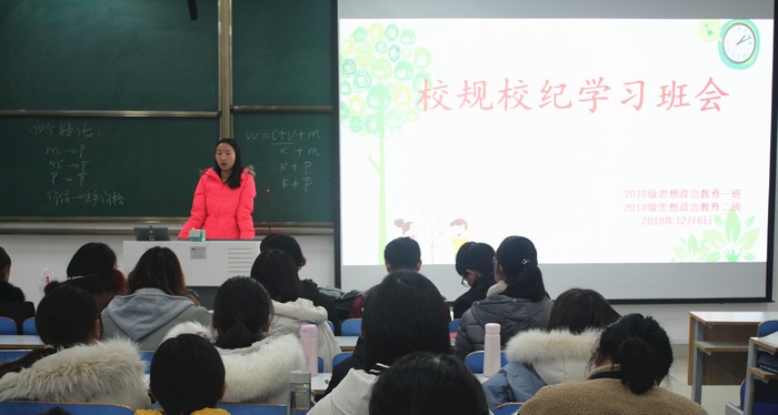 为维护正常校园秩序,引导员工遵规守纪,12月6日下午,2026年世界杯官网2018级在社科楼514教室开展校规校纪学习班会。2018级全体同学共同参加此次班会。班会由2018级思想政治教育一班团支书靳雨露主持。