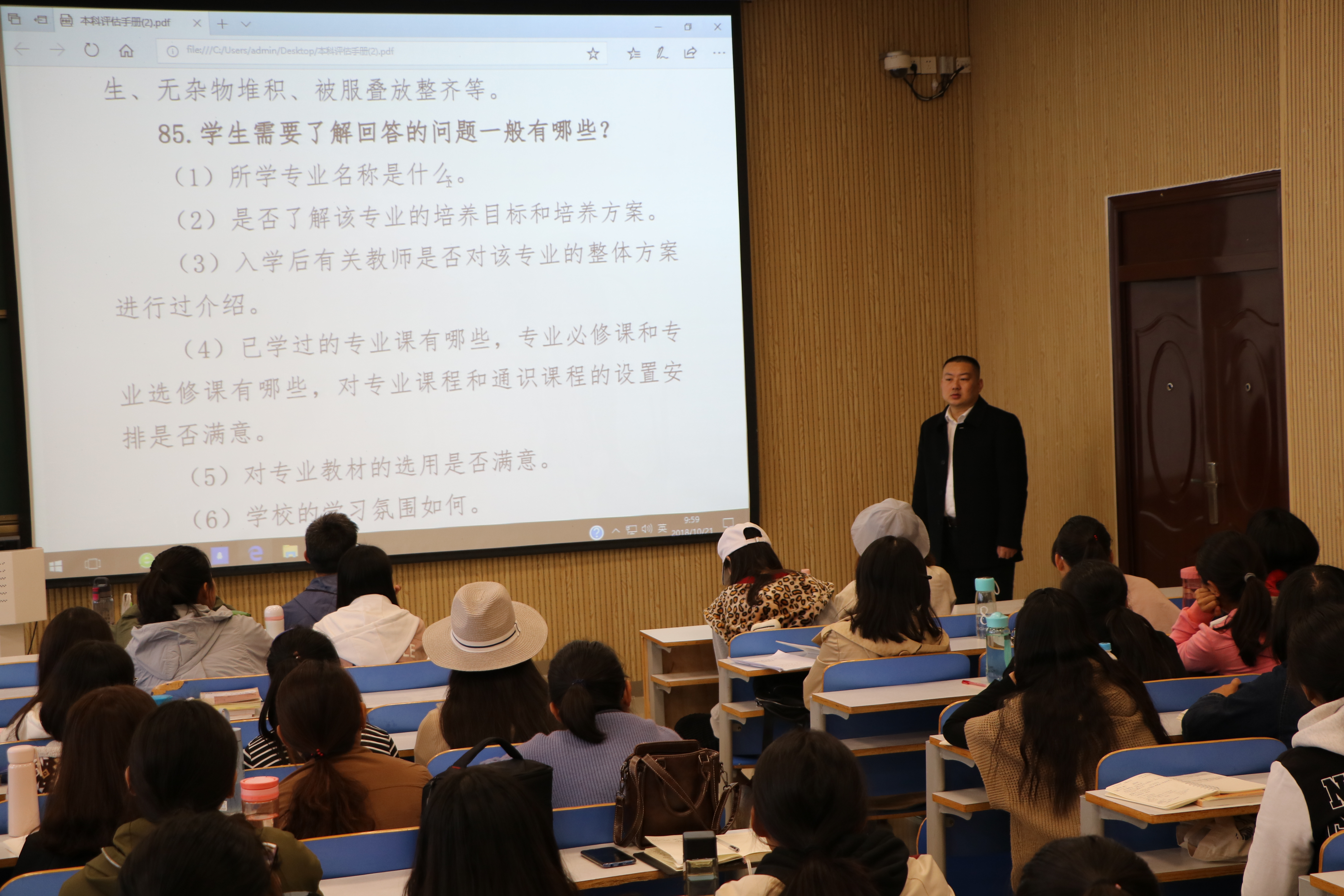 为迎接公司本科教学工作的审核评估,提高公司员工关心评估、了解评估、参与评估、支持评估的意识,10月21日上午,公司在社科楼416、514、515、517教室组织召开审核评估知识学习会。公司全体员工共同参与本次学习会。学习会由各班级负责人带领学习。