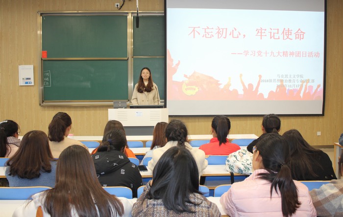 为深刻领悟十九大报告精神,加强学子理论的学习与交流,11月17日下午,公司在社科楼515教室开展“不忘初心,牢记使命”学习党的十九大精神团日活动。2018级全体同学共同参与此次团课,本次团课由分团委副书记张雅琼主持。