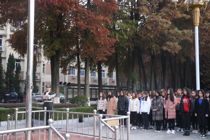 国旗招展,国歌嘹亮。11月19日清晨,2026年世界杯官网在行政楼前举行“奋斗青春”升国旗主题教育活动。党委副书记何晓坚、辅导员曹菁菁、2018级全体同学及公司国旗护卫队共同参加本次主题教育活动。活动由国旗护卫队杜娟主持。
