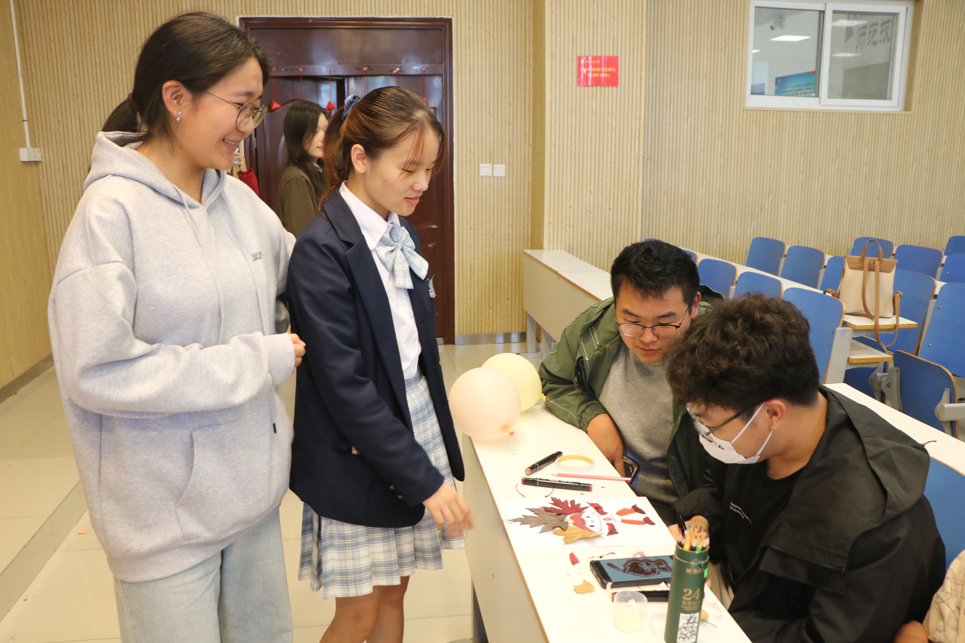 活动伊始,主持人李佳欣以“名字接龙”的游戏开场,调动现场气氛,增进了同学们之间的了解,拉近了距离,让略显生疏的成员迅速相识并投入到接下来的游戏中。紧接着,李佳欣带领大家开展“落叶心语”“心理沙龙”“心理涂鸦”游戏。同学们兴趣盎然、积极参与,随意发挥、自由创作,将奇思妙想宣泄于纸上,在语言与创意的互动中排解心理焦虑、表达内心困惑、接纳不完美自我。活动期间,公司志愿者热情洋溢,通过讨论分享、交流经验的形式积极引导同学们学会正确识别和表达情绪,帮助大家走出心理困境,激发个体潜能。活动结束后,主持人李佳欣做出总结,她强调,同学们在注重学习的同时也要关注自己的内心世界,学会正确识别和表达情绪、正确对待不良情绪,接纳自我、悦纳自我、热爱自我。