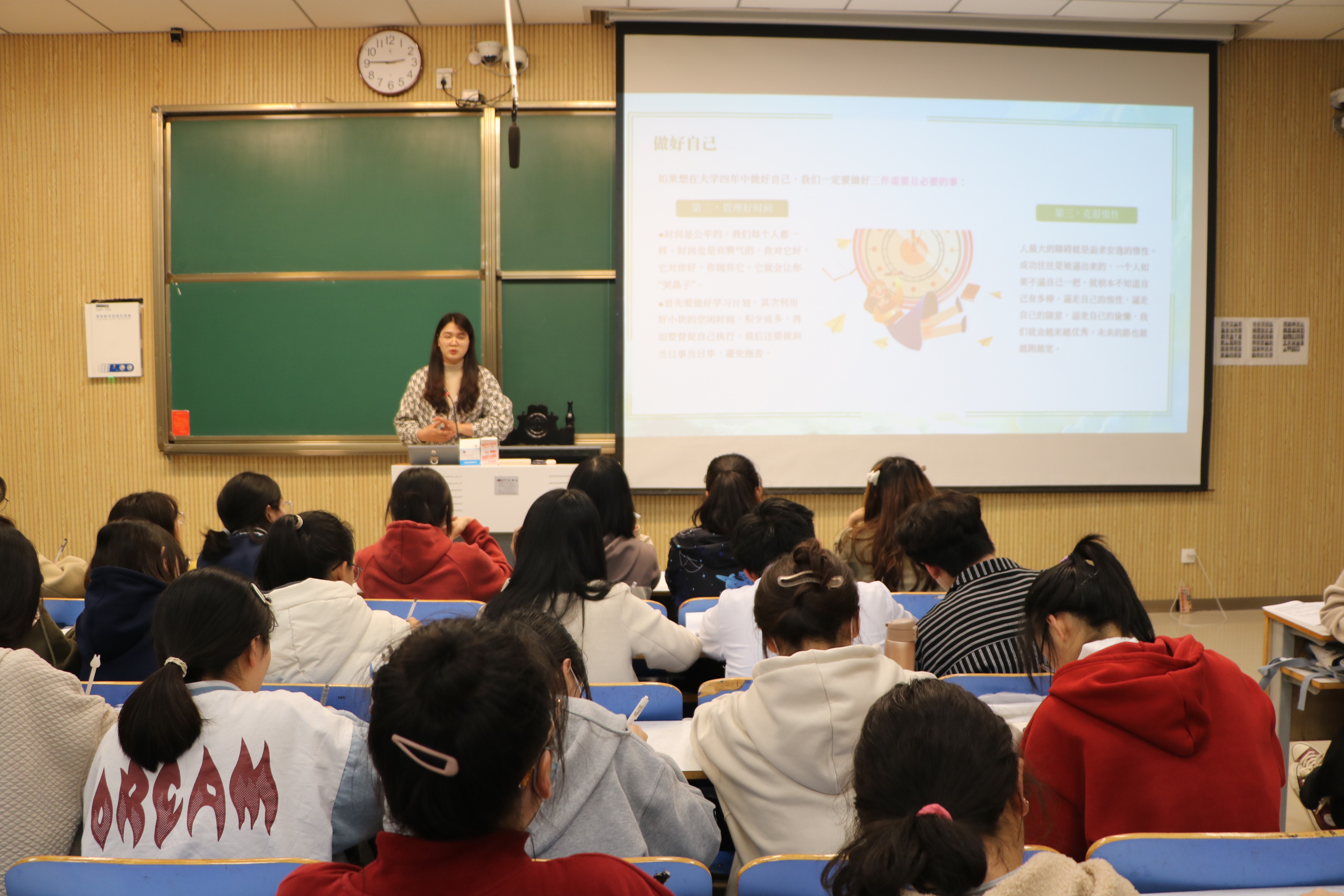 团课伊始,同学们共同观看共青团中央献给年轻人的微电影《撑天》,影片聚焦于少年的逐梦之旅,展现了习近平总书记对青年的热切寄望,给予同学们精神激励,促使新生努力完成属于年轻逐梦者的蜕变。随后,吴梦云从“大学是什么、大学应该如何度过、大学应该学会什么、新生适应期怎么过、未来发展规划”五个方面讲述团课内容,并结合亲身经历和感受来分享老员工活经验和规划。接着,三位新生代表积极分享自己的大学规划和未来目标,表达自己的期待与憧憬,其他同学也纷纷参与其中,提出自己的想法。最后,学长学姐们以视频形式发来寄语,分享自己的老员工活并提出宝贵建议,他们表示,大学期间要以分秒必争的劲头学习工作,以积极乐观的心态丰富生活,提前制定未来发展规划,积极参与校园活动和技能比赛,树立明确的学习目标。